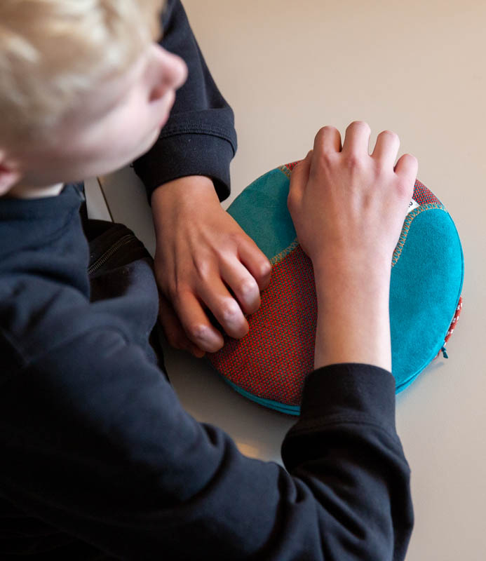 You have probably experienced the feeling of getting drowsy when travelling by train. The monotonous rhythm of the wheels puts you in an almost meditative state. The music played by an inmuRHYTHM has a similar monotonous repetition. When you touch an inmuRHYTHM you immediately hear a rhythmic pulse. When you hold it close to your body you can feel it – a pulse that continues until you put inmuRHYTHM down. The rhythm makes you want to run your hands or fingers over the cover. Or just fiddle with some of the tactile elements. It gives your brain a healthy break – from schoolwork or the computer. You do not need to have your mobile phone with you, because inmuRHYTHM does not need any apps or music streaming. inmuRHYTHM plays music when you just touch it. The music universe is not sounds or songs, but a rhythmic flow of music that follows your movements. This opens up endless possibilities for motivating musical activities.